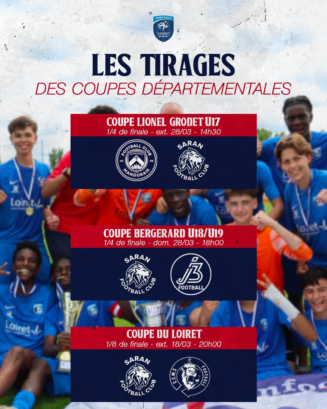 Nos 𝗨𝟭𝟲, 𝗨𝟭𝟴, 𝗲𝘁 𝘀𝗲𝗻𝗶𝗼𝗿𝘀 𝗥𝟮 sont toujours en lice pour la 𝗖𝗼𝘂𝗽𝗲 𝗱𝘂 𝗟𝗼𝗶𝗿𝗲𝘁. Retrouvez ci-dessous 𝗹𝗲𝘀 𝗱𝗶𝗳𝗳𝗲́𝗿𝗲𝗻𝘁𝗲𝘀 𝗮𝗳𝗳𝗶𝗰𝗵𝗲𝘀 !